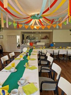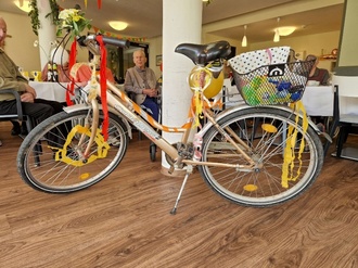 Auch der Vatertag wurde mit einer Feier im Hubertushof zelebriert. Dafür wurden alle Männer zu Kaffee und Kuchen in die herrlich geschmückte Cafeteria eingeladen. Nachdem sich alle gestärkt hatten, wurden gemeinsam zwei Fahrräder mit Krepppapier und Luftballons dekoriert, wie es auch früher zum Männertag üblich war. Außerdem hatten sich die Betreuungskräfte unseres Hauses ein paar lustige Spiele einfallen lassen, die den Männern sehr gefielen und eine tolle Abwechslung boten. Die Feier wird den Bewohnern sicher noch ein wenig in Erinnerung bleiben.