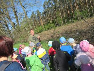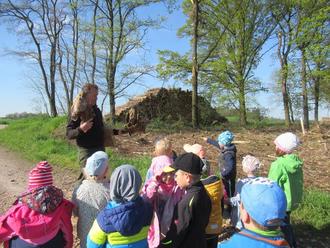 Am Freitag, dem 05.05.2023, ging es für unsere Gruppe in den Luppaer Wald. Gegen 7:45 Uhr starteten wir am Kindergarten per Auto in Richtung Luppa. Die Fahrt war nicht weit und so kamen wir schnell am Waldesrand an, wo auch schon der Jäger auf uns wartete. Wir begrüßten den netten Herren und beluden unseren Bollerwagen mit Picknickdecken, so dass unserer Entdeckungstour nichts mehr im Wege stand. Wir liefen am Waldrand los und kamen nach ungefähr 30 Minuten Fußmarsch an einem Hochstand an. Dort schlugen wir unsere Decken auf und genossen bei herrlichem Wetter unser Frühstück in der Natur. Nach der Stärkung durften wir auf den Hochstand, der unserem mitgereisten Jäger gehörte, klettern und konnten dabei den sehr schönen Blick auf ein großes Rapsfeld, der Ortschaft Luppa und dem dahinter liegenden Collm bestaunen. Wir durften sogar mit dem Fernglas des Jägers das vor uns liegende Panorama mal genauer unter die Lupe nehmen. Nach dieser Erfahrung zeigte uns der Jäger zwei ausgestopfte Vögel, einmal die Eule und den Bussard. Er erzählte uns viel über ihren Lebensraum, ihre Feinde, Beute und vieles mehr. Nach der Erklärung des Jägers liefen wir durch das Waldgebiet des Jägers, wobei er uns die unterschiedlichsten Sachen über den Wald erklärte, zum Beispiel warum ein Teil der Bäume so verrottet war oder warum es wichtig ist, dass der Tierbestand im Wald immer ausgeglichen sein muss.