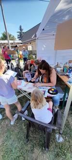 Hauptaugenmerk lag dabei wie immer auf den Kindern. Die Kinder wurden auf dem bunt mit Luftballons und Wimpeln geschmückten Spielplatz empfangen. Für jede Altersgruppe war etwas dabei, sei es Kinderschminken mit Ilona Möbius oder Bastelangebot mit Bineta Kopsch. Zur unterhaltsamen Belustigung für die Kinder gab es reichlich Spiele, alle Kinder konnten eine Spielstrecke abarbeiten und an jeder Station Stempel sammeln – dafür gab es am Ende so einige tolle Preise zu gewinnen. Zu den beliebtesten Spielen gehörten Dosenwerfen, Limbo, 4 Gewinnt, Bällealarm und Domino. In mühevoller Heimarbeit hat Vorstandsvorsitzende Fränze Schönert wochenlang geschraubt, gebaut und bemalt.