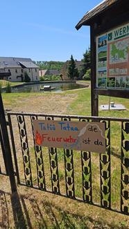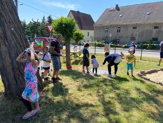 Nach der Begrüßung und einer ersten Runde über den Spielplatz konnten die Jungen und Mädchen zeigen was sie gelernt haben. Die Jugendfeuerwehr führte einen Löschangriff vor. Alle Gäste bestaunten die hohen Spritzfontänen, die gleich wieder ab in den Dorfteich gingen. Danach konnten die kleinen Bambinis der FFW Mahlis zeigen was sie drauf haben. Die Kinder führten einen Feuerwehr-Tanz vor, stellten sich mit der Kübelspritze unter Beweis und löschten eine brennende Holzattrappe. Für ausgelassene Stimmung sorgte mit musikalischer Untermaltung unser DJ Heiko.