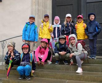 Am 6. Juni ca. 9 Uhr starteten die Vorschüler der Kita Calbitz mit dem Bus Richtung Oschatz. Der Weg führte uns zuerst zur St. Aegidienkirche. Dort begann unser Abenteuer. Wir begaben uns auf eine Märchenstadtführung mit einem „Märchenzwerg“. Den ersten Hinweis entdeckten wir schnell, ein Zopf hing an der Infotafel der Kirche. Natürlich wussten wir, dass das der Zopf von Rapunzel war.