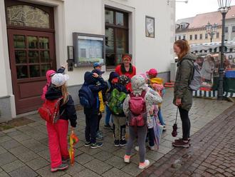 Der Märchenzwerg führte uns in Richtung Altmarkt und wir fanden am Brunnen eine goldene Kugel. Dies war der Hinweis auf das nächste Märchen „Der Froschkönig“. Als wir am Hotel „Zum Schwan“ ankamen, mussten wir länger darüber nachdenken, dass es sich hier um „Das hässliche Entlein“ handelte. Einige von uns kannten das Märchen. Voller Neugier liefen wir zum Brunnen auf dem Neumarkt und entdeckten das Schneeflockenkissen ohne große Mühe. Denn im Märchen von „Frau Holle“ spielt ein Brunnen eine wichtige Rolle. Besonders gefiel uns, dass der Brunnen anfing zu plätschern, als wir ein Lied sangen. Angekommen am Rathaus der Stadt Oschatz sahen wir einen Kerker bestückt mit Lebkuchen und einem Hexenbesen. Wir errieten das Märchen „Hänsel und Gretel“ richtig. Zum Schluss ging es noch in einen tiefen Keller unter dem Rathaus. Dort wartete das Märchen vom „Gestiefelten Kater“ auf uns. Im dunklen Sack, so hieß der Keller, durften wir sogar mit Taschenlampen im Dunkeln leuchten und das Licht war für einen kleinen Moment ganz aus. Da hatten ein paar Kinder von uns ein bisschen Angst. Diese hielt jedoch nicht lange an, da wir uns nun auf die Suche nach einem versteckten Schatz begaben.