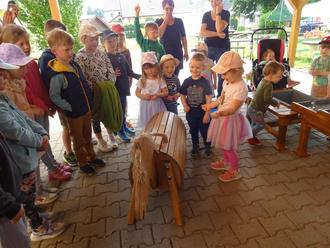 Zusätzlich zur Matschstrecke wurde noch ein kleines Holzpferd enthüllt. Dieses konnte über den Förderverein Wirbelwind Calbitz e.V. angeschafft werden.