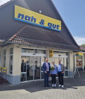 Bürgermeister Matthias Müller gratuliert Marktleitung Frau Anke Witschel und Geschäftsführer Herrn Patrick Lüdtke zur Wiedereröffnung vom Einkaufsmarkt in Wermsdorf.