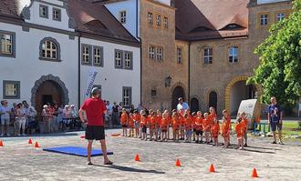 Anschließend zeigten die „Turntiger“ – die Kleinsten Mitglieder des Turnvereins Wermsdorf – ihr Können auf dem Schlosshof des Alten Jagdschlosses. Sie führten Tänze auf und sportlich ging es durch einen Parcours. Bei Kaffee und Kuchen verfolgten Eltern, Großeltern und Gäste die Darbietungen der kleinen Akrobaten.
