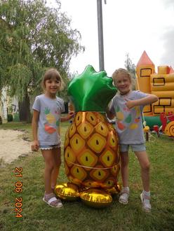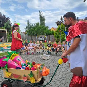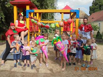 Dann kam plötzlich Unruhe im Kitagarten auf – hatte sich doch ein ungebetener Gast auf unser Abschlussfest geschlichen. „Das Schokobon“ besuchte uns und wollte den Kindern erklären, dass es doch am besten schmecke und vor allem am gesündesten sei. Doch unsere Kinder wussten es natürlich besser und schickten das Schokobon gleich wieder davon. Stattdessen riefen sie laut nach „Frau Apfel“ und „Frau Erdbeere“. Und siehe da, da kamen die beiden fitten Früchtchen fröhlich um die Ecke gehüpft. Im Gepäck hatten sie einen prall gefüllten Zuckertütenwagen, den sie an die Kinder verteilen wollten. Aber die Zuckertüten gab es nicht einfach so. Vorher mussten noch kleine Rätsel rund um das Thema „Obst“ gelöst werden. Für unsere fitten Döllnitzküken aber gar kein Problem und so bekam natürlich jedes Kind eine tolle Zuckertüte überreicht.