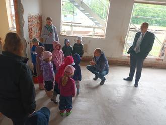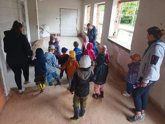 Am Dienstag, dem 01.08.2023 wurden wir Kinder und Erzieher von unserem Bürgermeister zur Baustellenbesichtigung in die ehemalige Grundschule von Mahlis eingeladen. Im Erdgeschoss wurden wir von Herrn Goldbach herumgeführt und bekamen einen Überblick vom Rohbau unserer zukünftigen Kindertagesstätte. Es gab Betonfußböden, ein bodentiefes Fenster in jedem Raum, große Kabel und Leerrohre bzw. Abflussrohre, Holzdecken und unverputzte Ziegelwände.