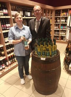 Dieser ist ab sofort im nah & frisch- Markt in Wermsdorf sowie in der Touristinformation in Wermsdorf erhältlich. Bei dem Weißwein handelt es sich um einen trockenen, weißen Burgunder. Bürgermeister Matthias Müller und Filialleiterin des nah& frisch- Marktes Anke Witschel präsentieren das neue Souvenir.