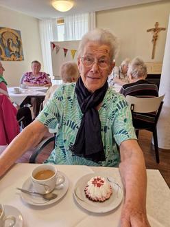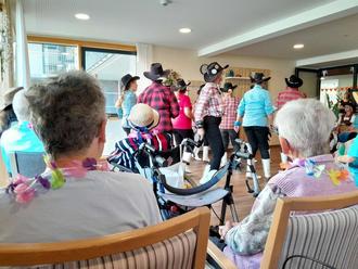 Nach einem leckeren Eistörtchen, welches es zum Kaffeetrinken gab, wurden alle Bewohner und Bewohnerinnen in das Erdgeschoss begleitet, wo das Programm stattfinden sollte. Nach einer Eröffnungsrede von Fr. Berentzik, der Einrichtungsleitung, wurden die Bewohner eingeladen ein paar Stimmungslieder gemeinsam mit den Kolleginnen der Betreuung zu singen. Anschließend führte die Line-Dance-Gruppe „Cavertitzer Westernladys“ Tänze zu verschiedenen Liedern im Western-Stil auf. Die Bewohner freuten sich sehr über die Vorführung, klatschten und sangen im Rhythmus mit. Vielen Dank nochmal an alle Mitwirkenden.