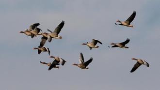 Graugänse im Formationsflug gen Süden über dem vogtländischen Himmel. Man erkennt sie an den typisch orangefarbigen Schnäbeln