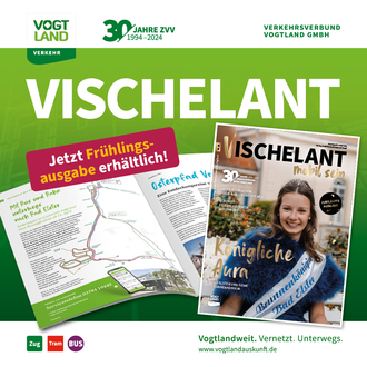 Der Verkehrsverbund Vogtland hat die nunmehr 30. Ausgabe seines Kundenmagazins VISCHELANT herausgebracht. Das Kundenmagazin steckt voller regionaler Geschichten und Menschen, die etwas für die Region bewegen. Gemacht für alle Vogtländer und Gäste, um zu zeigen, was alles im Vogtland steckt. Das ÖPNV-Mobilitätsangebot ist ein wichtiger Teil davon. Deshalb finden sich im Magazin natürlich auch viele praktische Informationen für die Nutzung der öffentlichen Verkehrsmittel im Vogtlandnetz und darüber hinaus.