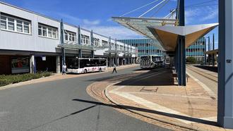 Busbahnhof Plauen mit SaisonBus-Linie 74 und TaktBus-Linie 92 Foto: Verkehrsverbund Vogtland GmbH
