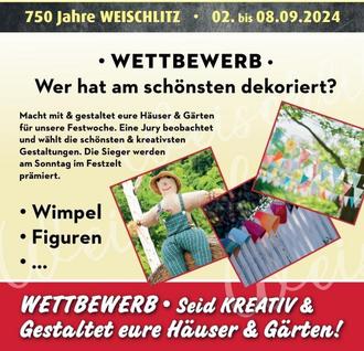 Wir rufen einen Wettbewerb des „Schönsten Gartenzauns von Weischlitz“ aus. Eine Jury wird die am schönsten, originellsten oder auffälligsten geschmückten Grundstücke auserwählen. Die Sieger werden am Sonntag im Festzelt dann auch prämiert. Selbstverständlich spielt dabei der „Gartenzaun“ eher eine untergeordnete Rolle. Das Gesamtkunstwerk zählt.