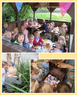 Anschließend wurde es spannend! Da hatte doch tatsächlich irgendjemand eine kleine Schatzkarte vor der Haustür verloren. „Die ist bestimmt für uns!“, riefen alle einstimmig, und die Suche ging los. Fast jeder Grashalm wurde umgedreht und hinter jeden Baum oder Busch geschaut. Mit viel Eifer und Teamgeist meisterten die Kinder die schwierige Suche, bis am Ende die Schatztruhe gemeinsam geöffnet werden konnte. Die Freude über kleine Preise war groß, und jedes Kind durfte sich eine kleine Überraschung aus der Kiste aussuchen.