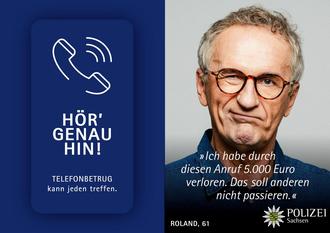 Die Polizei Sachsen informiert mit ihrer aktuellen Kampagne „HÖR‘ GENAU HIN! Telefonbetrug kann jeden treffen.“ regelmäßig über die Gefahren des Telefonbetrugs und klärt auf vielfältige Weise über das richtige Verhalten auf.