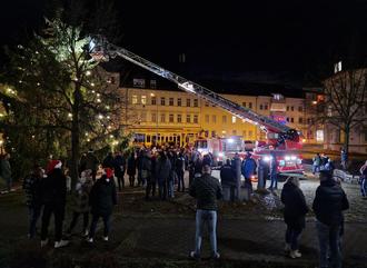 Um 17 Uhr ist pünktlich die Drehleiter der Berufsfeuerwehr Leipzig vor Ort gewesen. Die Kinder gaben den Feuerwehrmännern die Christbaumkugel zum aufhängen.