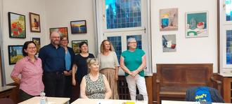 Die neuen Ortschaftsräte werden in einer feierlichen Zeremonie vereidigt. An den Wänden des Rathaussaales sind die Bilder der Montagsmalerinnen zu sehen.