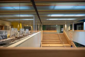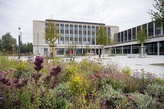 Der neue Schulbau beeindruckt auf den ersten Blick: Der großzügige Eingangsbereich mit Foyer, Aula und Mensa, die bunten Deckenpaneele und die imposante zentrale Holztreppe mit integrierten Sitzbänken schaffen eine einladende Atmosphäre.