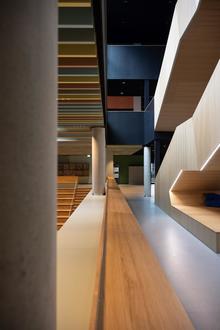 Besonders die Farbgestaltung des Gebäudes sticht hervor: Jede der vier Etagen ist in einer eigenen Farbwelt gehalten – von salbeigrün im Erdgeschoss über Gelbtöne im ersten Stock, rosé in der zweiten Etage bis hin zu blaugrün in der dritten, die für die naturwissenschaftlichen Fachräume reserviert ist. Diese Farben harmonieren mit Elementen aus Echtholz, was den Räumen eine warme und moderne Ausstrahlung verleiht.