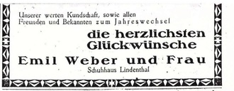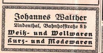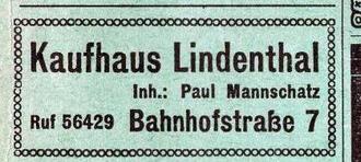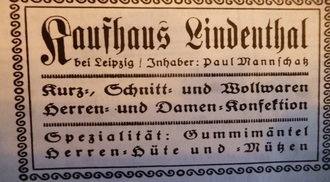 Das Kaufhaus Lindenthal des Schneidermeisters Paul Mannschatz hatte die größten Schaufenster- und Ladenflächen in Ort. Sein Sortiment: Konfektion, Stoffe und Wollwaren.