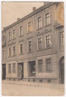Richard Nitzsche hatte in seinem Haus/Hinterhaus an der Bahnhofstraße eine Klempnerei. Vorn war nur die Werbung und im Hinterhaus wurde gearbeitet. Foto 1920