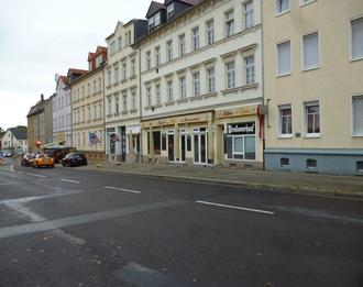 Heute lädt uns Andreas Armbrust in einem Teil des Mannschatz-Kaufhauses zum Eisbecher in sein „Kirschkaffee“ ein. Weiter links ebenfalls an der Bahnhofstraße bietet A. Armbrust im ehemaligen Friseursalon Otto Schmeil sein Gemüse/Obstsortiment an. Sehr gute Beispiele der Nachnutzung.