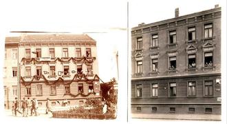 Merken Sie etwas? Am rechten Foto von 1918 fehlt noch das Verbindungshaus mit der Durchfahrt und dem Fahrradladen. Hier war der Autor in den 50iger Jahren oft anzutreffen und ein junges Mädchen (die Tochter des Chefs, heute Frau Eichner aus der E.-Thiele-Str.) half ihrer Mutter beim Verkaufen.