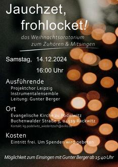 Wir laden herzlich am 14.12. um 16:00 Uhr in die Kirche Podelwitz zum Weihnachtsoratorium zum Mitsingen und Zuhören ein. Unter der Leitung von Gunter Berger spielen und singen der Projektchor Leipzig "Sing along" und das Instrumentalensemble. Der Eintritt ist frei, um Spenden wird gebeten.