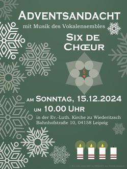 Wir laden am 15.12. um 10:00 Uhr zu einem besonderen Gottesdienst in die Kirche Wiederitzsch ein. Ausgestaltet wird dieser vom Vokalensemble Six de Choeur, Leipzig. Das sind sechs Sängerinnen und Sängern mit langjähriger Erfahrung in klassischem Gesang und Chormusik.