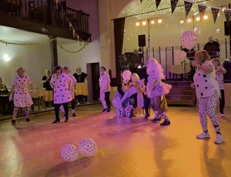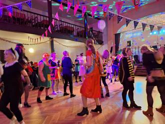 Traditionell natürlich mit Kaffee und Pfannkuchen. Nach dem Einmarsch von Heidi und Martina kommt immer die Polonaise, wo alle dabei sind, und der ganze Saal tobt.