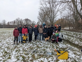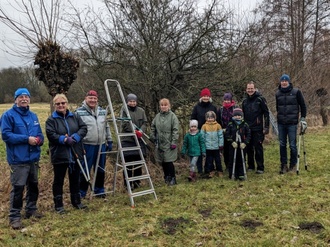 In der ersten Aktion fanden sich 17 Eltern, 5 Kinder und ein Hund von einem Kindergarten ein, die ein Tipi aus Weidenruten bauen wollen. Bei solch starker Mannschaft war die Anzahl der benötigten Weidenruten nach kurzer Zeit geschnitten und sortiert.Der Abtransport mit einem Transporter war gut organisiert und problemlos. Bei einem zweiten Einsatz, vierzehn Tage später, waren nochmals 8 Erwachsene und 3 Kinder unserem Aufruf gefolgt. Das Schnittgut ist heiß begehrt und wird bis auf die letzte Rute zu Bastelzwecken, Flechtarbeiten oder Bau von Weidenhütten von den Helfern mitgenommen und genutzt. Kinder konnten schon vor Ort an vorbereiteten Korbböden mit ersten Korbflechtarbeiten beginnen. Und getreu nach dem alten Spruch „viele Hände – schnelles Ende“ war nach zwei Stunden alles geschafft, das Werkzeug zusammengeräumt und die Autos vollgepackt. Es hat Allen Spaß gemacht und von der Pflege der wertvollen Kopfweiden bis zur nachhaltigen Verwertung des Schnittgutes war die Aktion eine "Runde Sache".
