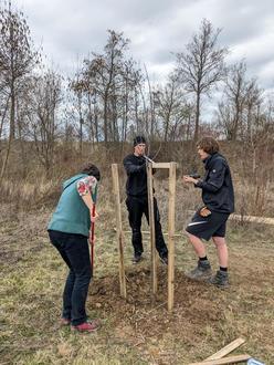 Eine Fläche von 1,5 ha am Ortsausgang von Plaußig (Stralsunder Str) wird seit ca. einem Jahr als Biotop mit verschiedenen Lebensräumen entwickelt. Lesesteinhaufen, Totholzhaufen, Sandhaufen, Nistkästen für Kleinvögel, Insektenhotels, Bienenkästen und Igelhäuser für die kleinen krumm-beinigen Stacheltiere und zwei Blühwiesen bieten schon eine Menge an Lebensraum. Komplettiert wurde die Artenvielfalt auf dem Biotop durch das Anlegen einer Streuobstwiese. So wurden an zwei Wochenenden 17 Obstbäume alter Sorten in die Erde gebracht. Pflaumen-, Kirschen- und Apfelbäume mit unterschiedlichen Blühzeiten werden den Insekten Nahrung bringen und in einigen Jahren auch Früchte zum Ernten. Die Pflanzungen gestalteten sich unterschiedlich. Am ersten Wochenende waren drei Rotary Clubs aus Leipzig mit dreißig Austauschschülern aus 15 verschiedenen Ländern zur Hilfe vor Ort bereit. Leider verhinderte Schnee, viel Regen und damit Schlamm einen praktischen Einsatz. So konnte nur das Informationsschild enthüllt und den ausländischen Schülern der gute Zweck umfangreicher Naturschutzarbeit erläutert und den „Rotarien“ herzlich für die vorbildliche Zusammenarbeit und großzügige Unterstützung gedankt werden. Der zweite Pflanztermin, begleitet von frühlingshaftem Wetter, stand unter der Überschrift „160-jähriges Firmenjubiläum“ der Leipziger Kisten-und Leistenfabrik. Eng mit dem Naturschutz verbunden wollte auch die Leipziger Kisten- und Leistenfabrik ihren Beitrag zu Gestaltung des Biotopes beigetragen. Mit großem Eifer wurden die Bäume gesetzt, die Pflanzpfähle eingerammt und die Stämme fachgerecht an den Pfählen fixiert. Als finale Aktion erfolgte der Pflanzschnitt und das Anbringen des Verbissschutzes. Damit ist die Streuobstwiese vorerst komplett angelegt. Das Wässern der Bäume und die Pflege des Biotopes wird durch den BVL ausgeführt. Damit ist das Anwachsen und die Weiterentwicklung gesichert. Parallel zur Pflanzveranstaltung wurde eine Kindergruppe fachlich in der Naturschutzarbeit eingewiesen und beim Rundgang auf dem Biotop praktisch im Frage- und Antwortspiel fit gemacht. Nach getaner Arbeit wurde noch im Grünen ein sehr reichhaltiges Picknick eingenommen und für die Kinder gab es heiße Kartoffelsuppe über der Feuerschale. Bei guten Gesprächen war sich am Ende jeder bewusst, etwas Sinnvolles und Nutzbringendes für die Natur getan zu haben, und zudem hat es auch noch richtig Spaß gemacht.