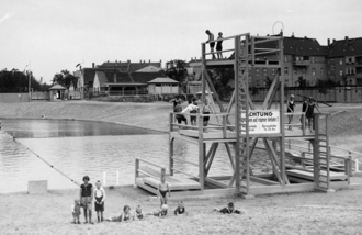 Foto 1940, Man beachte den 3m und 5 m hohen hölzernen Sprungturm.