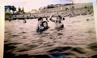Familien und Kinder waren die ersten begeisterten Badegäste. Der 92-jährige Gemeindebote-Leser Herr Spalteholz aus der Erich-Thiele-Straße zeigt uns mit erhobener Faust ~ 1930 seine Freude über das schöne Bad.