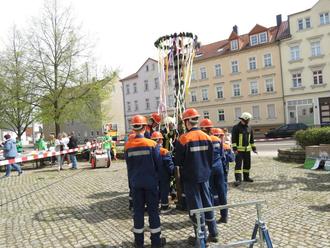 Auch die Jugend war nicht tatenlos und so wurde auch von der Jugendfeuerwehr Lindenthal der kleine Maibaumbruder zum Marktplatz getragen, aufgestellt und anschließend mit Süßigkeiten für die kleinsten Gäste bestückt.