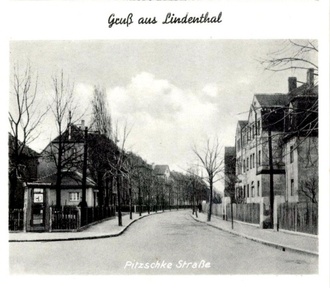 Zum 1. Kindergarten der Genossenschaft habe ich zur letzten Folge im Gemeindeboten etwas nachzutragen. Links eingangs der Pitzschke-Straße steht noch die Telefonzelle. Dahinter als Anbau an die Hausnummer 1 erkennt man den 1. Lindenthaler Kindergarten von 1913 für die Genossenschaftskinder.