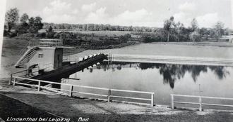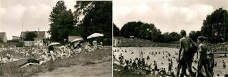Foto 1948~50, erstes Nachkriegsfoto (Postkarte), Archiv Busse Die Bäume sind noch klein und das Schwimmbecken ist noch von einem Sandstrand umgeben. Das sind die kleinen Orientierungen Aber die neue Gemeindeverwaltung unter Führung des Schwimmveterans Walter Schönzart machte 1947 sofort ernst mit der Wiederbelebung des Schwimmsports im Lindenthal. Volksbadetag am 6. Juli 1947 mit großen schwimmsportlichen Vorführungen und ab 18:00 Uhr großer Festball im Alten Gasthof.