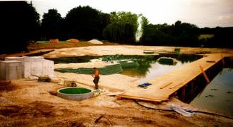 Das neu Ökobad nimmt mit 5160 qm Wasserfläche Gestalt an. Davon sind 2500 qm bepflanzte Regenerationsfläche auch mit Fisch- und Froschbesatz. Alle hölzernen Altgebäude, die Startbrücke, das Planschbecken und andere liebgewonnenen Badobjekte sind jetzt Historie.