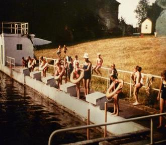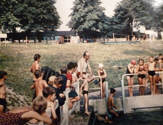 Im Kassenhäuschen saß die freundliche Mutter Schönzart, die uns mit einer Dauerkarte für 2,- Mark durchwinkte und deren Tochter, die Bademeisterin Herta Wolf, brachte den ganz Ahnungslosen an der Angel das Schwimmen bei.