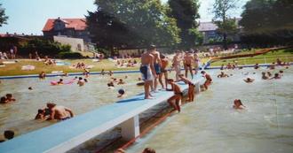 Lassen Sie sich anstecken von der ausgelassenen Kindheit und Jugendzeit, die wir in den Sommermonaten im Familienbad verbrachten. In den Sommerferien war von morgens 8:00 bis 19:00 Uhr nichts schöner und wichtiger als mit seinen Freunden den Tag im Freibad zu verbringen. Zu Mittag hat uns Elke Bock im Imbiss mit Limo und Bockwurst versorgt (aber nur wenn wir gerade reich waren). Wir hatten nichts am Bad auszusetzen: die Preise waren mini, das Wasser war grün und die Toiletten konnte man schon von weitem riechen.
