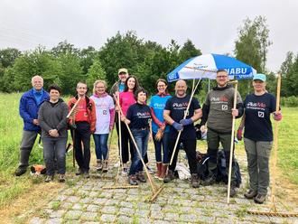 In vier Abschnitten erfolgte die Mahd auf den beiden großen Wiesen des Biotopes, meist bei feuchtem Wetter. Der Einsatz des Balkenmähers vom Stadtforsten hat sich bestens bewährt, obwohl Ameisen, Maulwurf und Wühlmaus schon einiges an Erde nach oben gestülpt hatten. Die Grasmasse war enorm, weil der gesamte Mähbereich schon 2 Jahre auf dem Halm steht und somit hoch gewachsen war. Die partielle Mahd bewährt sich bestens, so dass eine Abmagerung und Vermehrung der Pflanzenvielfalt schon zu registrieren ist. Jetzt galt es, die gesamte Grasmasse von der Wiese zu bekommen. Dazu braucht es kräftige Hände – viele Hände. Woher nehmen, denn der Helferzulauf in unserem nördlichen Randgebiet ist nicht üppig. Die angesagte Hilfe kam von einem Helferteam der LBBW, Landesbank Baden-Württemberg. Naja, SocialDay war angesagt von Büro-Menschen. Vorsichtshalber lieber Lederhandschuhe vorhalten wegen der Blasen. Doch weit gefehlt. Schon die vorgeschaltete Kommunikation war lustig – und dann kam der Trupp, überpünktlich, fast 20 Minuten eher. Die übliche Einweisung und Vorstellung des Biotopes, Gruppenfoto mit Werkzeug, und los ging der Spaß. Es entstanden riesige Grasberge, die mit Planen zu den Kompoststellen geschleppt wurden, erste Jacken wurden beiseite gepackt, der Schweiß floss. Erster Teil des Arbeitsergebnisses war erstaunlich. Dann die übliche kurze Verschnaufpause mit lecker Häppchen, von Brigitte nett zurecht gemacht, ein Schluck selbstgepressten aus der Biopulle und schon kamen nette Gespräche in Gang. Unser Imker vom Biotopverbund spendet jedem Helfer noch ein Glas Honig aus den Beuten auf dem Biotop, Samentütchen und Infomaterial wurde verteilt und auf ging es zu zweiten Runde. Auch die zweite Wiese hinter dem Mittelwall wurde noch beräumt und in wirklicher Rekordzeit war das Werk vollbracht. Alle Achtung, was Büromenschen so leisten können. Gelästert wurde, Spaß hat es gemacht, und selbst Regen hat die Laune nicht verdorben. Für weitere Einsätze ist dieses Team bestens geeignet. Herzlichen Dank an das tolle Team der LBBW, der Landesbank Baden-Württemberg