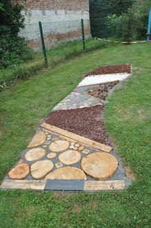 Der Außenbereich des Kindergartens sollte erweitert werden. Zum einen wurden Hochbeete, eine Matschküche und das ganz große Projekt, ein Sinnespfad, errichtet.
