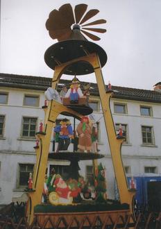 | 1. | Ein Wahrzeichen der Holzschnitzerei, die Weihnachts-Pumphut-Pyramide auf dem heute und künftigen Adventsmarkt |