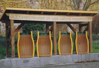 | 2. | Sitzbänke: Geschnitzte Bänke nach dem Motiv der Weinbrand-Fässer der Wilthener Weinbrennerei von Jürgen Spottke |