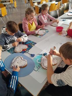 Einige Tage später kam der Bäckermeister in unsere Schule, denn wir wollten die Pfefferkuchenherzen verzieren. Dazu mussten wir erst einmal eine Spritztüte aus Papier basteln. Das war gar nicht so einfach!