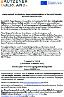 Die LEADER-Region Bautzener Oberland hat den Projektaufruf 2023-2 am 20. September 2023 gestartet. Bis zum 28. Februar 2024 können Projektideen zu unterschiedlichsten Maßnahmen im Handlungsfeld Grundversorgung und Lebensqualität entwickelt und bei den Mitarbeiterinnen des Regionalmanagements eingereicht werden. Die Auswahlsitzung des Koordinierungskreises wird voraussichtlich im April 2024 stattfinden.