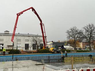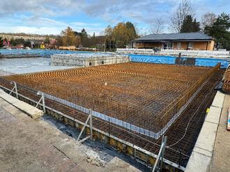 Im November wurde die komplette Bodenplatte in drei Teilabschnitten betoniert. Parallel dazu begannen die Schal- und Bewehrungsarbeiten für die neuen Beckenwände, von denen Ende November bereits ein Großteil betoniert war.