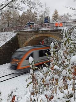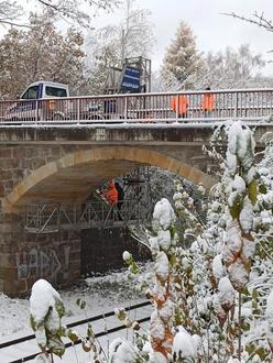 Am Dienstag den 28.11.2023 fanden die Brückenprüfungen der beiden Bahnbrücken im Bereich oberhalb der Waldstraße in Wilthen und in Tautewalde an der Straße zur unteren und oberen Siedlung statt. Zur Begutachtung der Brückenunterseiten war ein sogenanntes Brückenuntersichtgerät erforderlich. Dieses wurde lange im Voraus bestellt und für den Tag der Brückenprüfung gemietet. Die Oberseiten der Brücken werden aufgrund der Witterungsverhältnisse zu einem späteren Zeitpunkt geprüft.