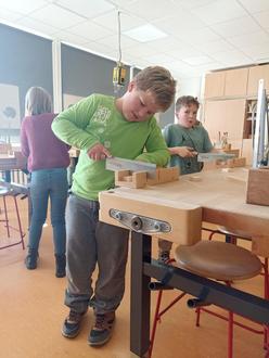 Der sachgerechte Umgang mit Werkzeugen und Werkstoffen wird bereits im Fach Werken angebahnt. Im Ganztagsangebot haben die Schülerinnen und Schüler jedoch die Möglichkeit, diese Fähigkeiten zu vertiefen und zu festigen. Es wird gemessen, angerissen, gesägt, gebohrt, geklebt und vieles mehr. Dabei erhalten die Kinder hilfreiche Tipps und individuelle Unterstützung, damit ihre Werkstücke gelingen und sie stolz auf ihre Ergebnisse sein können.