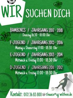 Die SG Wilthen Nachwuchsteams sind auf der Suche nach fußballinteressierten Mädchen und Jungen. Wenn ihr Interesse habt, schaut mal zu den genannten Trainingszeiten auf dem Sportplatz in Wilthen vorbei. Habt ihr Fragen, dann schreibt uns einfach an.